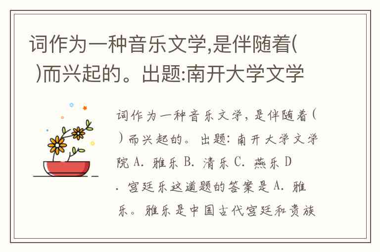 词作为一种音乐文学,是伴随着( )而兴起的。出题:南开大学文学院 A. 雅乐 B. 清乐 C. 燕乐 D. 宫廷乐