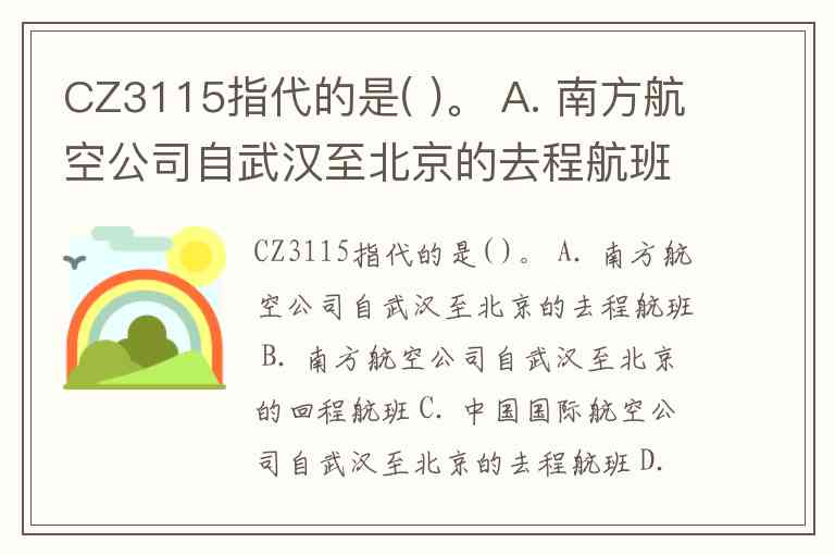 CZ3115指代的是( )。 A. 南方航空公司自武汉至北京的去程航班 B. 南方航空公司自武汉至北京的回程航班 C. 中国国际航空公司自武汉至北京的去程航班 D. 中国国际航空公司自北京至武汉的回程航班