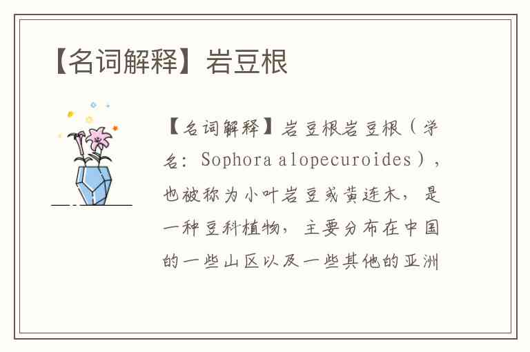 岩豆根(学名:Sophora alopecuroides),也被称为小叶岩豆或黄连木,是一种豆科植物,主要分布在中国的一些山区以及一些其他的亚洲地区。