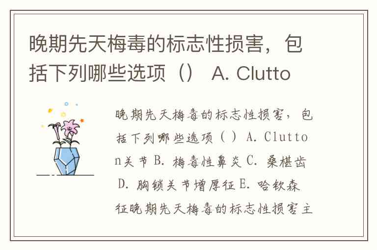 晚期先天梅毒的标志性损害,包括下列哪些选项() A. Clutton关节 B. 梅毒性鼻炎 C. 桑椹齿 D. 胸锁关节增厚征 E. 哈钦森征