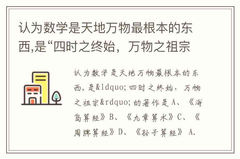 认为数学是天地万物最根本的东西,是“四时之终始,万物之祖宗”的著作是 A、《海岛算经》B、《九章算术》C、《周牌算经》D、《孙子算经》 A. 海岛算经 B. 九章算术 C. 周牌算经 D. 孙子算经