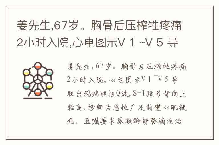 姜先生,67岁。胸骨后压榨牲疼痛2小时入院,心电图示V 1 ~V 5 导联出现病理性Q波,S-T段弓背向上抬高,诊断为急性广泛前壁心肌梗死。医嘱要求尿激酶静脉滴注治疗,其目的是 A. 疏通心肌微循环 B. 溶解冠脉内血栓 C. 扩张血管 D. 抗凝治疗 E. 减轻心脏前负荷