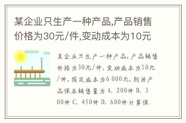 某企业只生产一种产品,产品销售价格为30元/件,变动成本为10元/件,固定成本为6 000元,则该产品保本销售量为 A. 200件 B. 300件 C. 450件 D. 600件