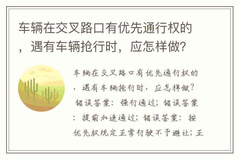 车辆在交叉路口有优先通行权的,遇有车辆抢行时,应怎样做? 错误答案:强行通过; 错误答案:提前加速通过; 错误答案:按优先权规定正常行驶不予避让;