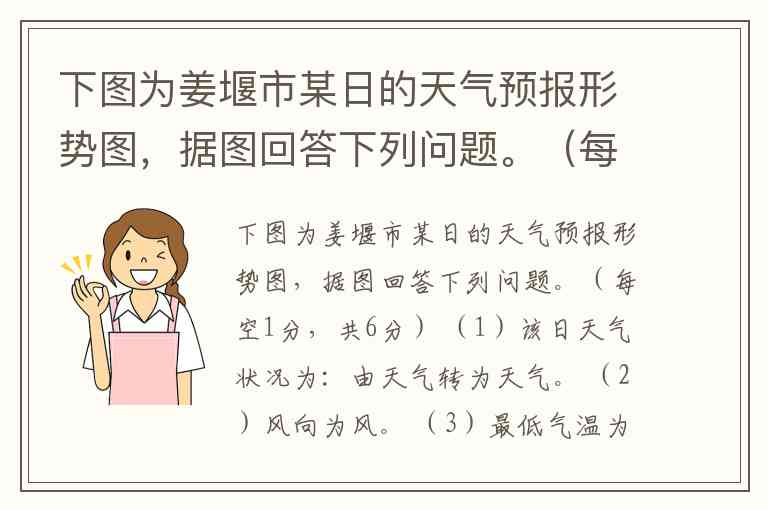 下图为姜堰市某日的天气预报形势图,据图回答下列问题。(每空1分,共6分) (1)该日天气状况为:由天气转为天气。 (2)风向为风。 (3)最低气温为℃,气温日较差为℃。 (4)气温-7℃大致出现在该日的左右。