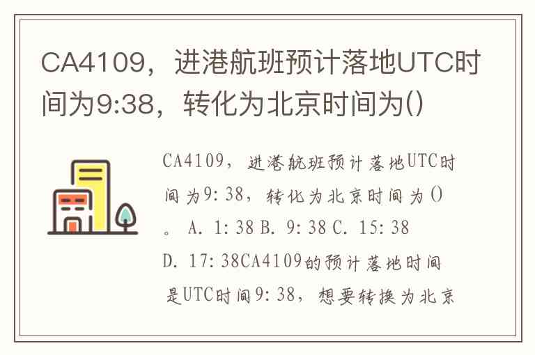 CA4109,进港航班预计落地UTC时间为9:38,转化为北京时间为()。 A. 1:38 B. 9:38 C. 15:38 D. 17:38