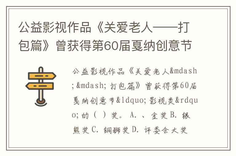 公益影视作品《关爱老人——打包篇》曾获得第60届戛纳创意节“影视类”的( )奖。 A. 、金奖 B. 银熊奖 C. 铜狮奖 D. 评委会大奖
