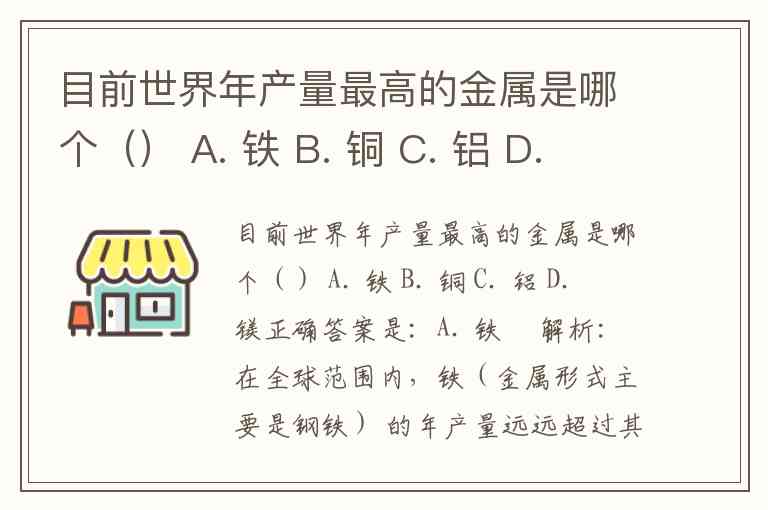 目前世界年产量最高的金属是哪个() A. 铁 B. 铜 C. 铝 D. 镁