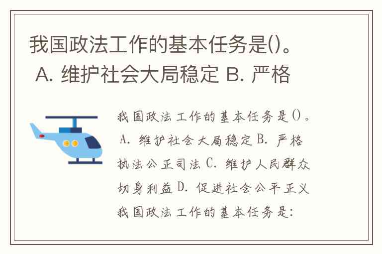 我国政法工作的基本任务是()。 A. 维护社会大局稳定 B. 严格执法公正司法 C. 维护人民群众切身利益 D. 促进社会公平正义