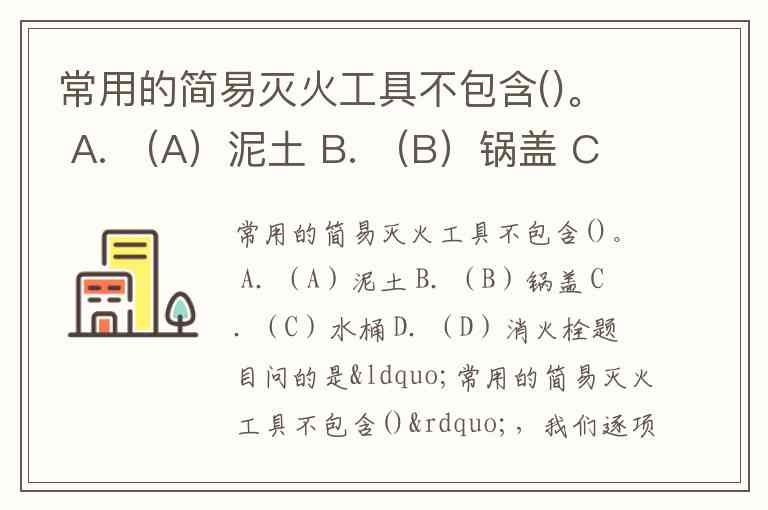常用的简易灭火工具不包含()。 A. (A)泥土 B. (B)锅盖 C. (C)水桶 D. (D)消火栓