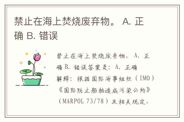 解释:根据国际海事组织(IMO)《国际防止船舶造成污染公约》(MARPOL 73/78)及相关规定,禁止在海上焚烧废弃物,尤其是塑料和其他有害废弃物,以防止海洋污染和生态破坏。