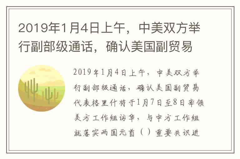 2019年1月4日上午,中美双方举行副部级通话,确认美国副贸易代表格里什将于1月7日至8日率领美方工作组访华,与中方工作组就落实两国元首()重要共识进行积极和建设性讨论。 A. 中国会晤 B. 美国会晤 C. 加拿大会晤 D. 阿根廷会晤
