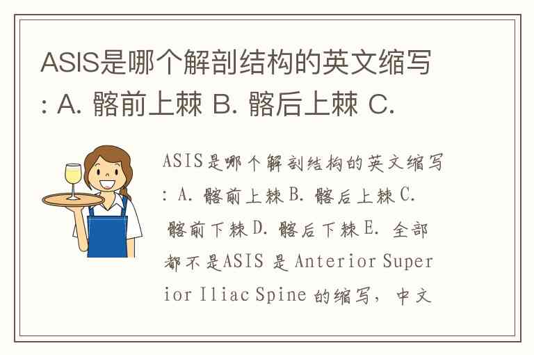 ASIS是哪个解剖结构的英文缩写: A. 髂前上棘 B. 髂后上棘 C. 髂前下棘 D. 髂后下棘 E. 全部都不是