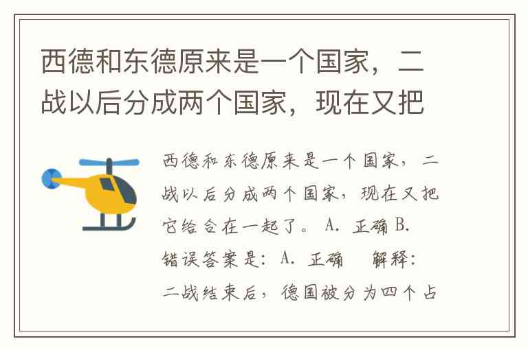 西德和东德原来是一个国家,二战以后分成两个国家,现在又把它给合在一起了。 A. 正确 B. 错误