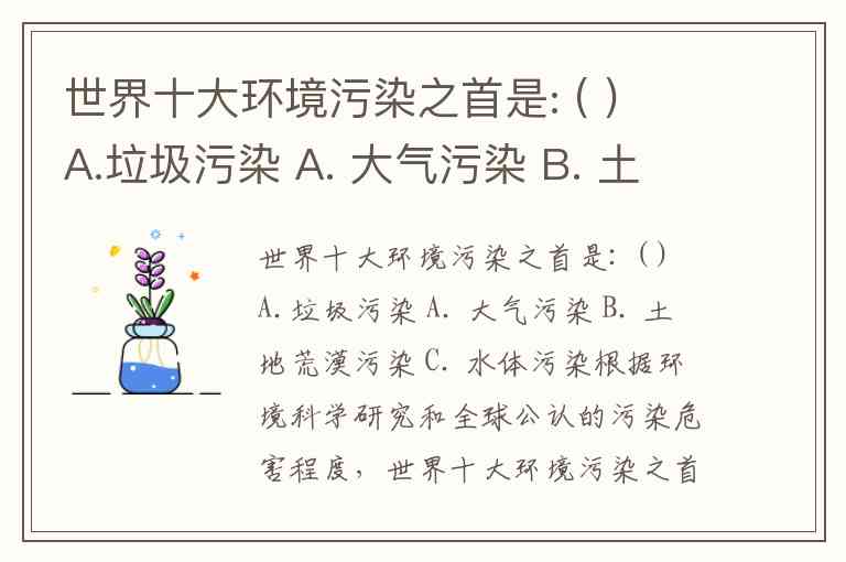 世界十大环境污染之首是: ( ) A.垃圾污染 A. 大气污染 B. 土地荒漠污染 C. 水体污染