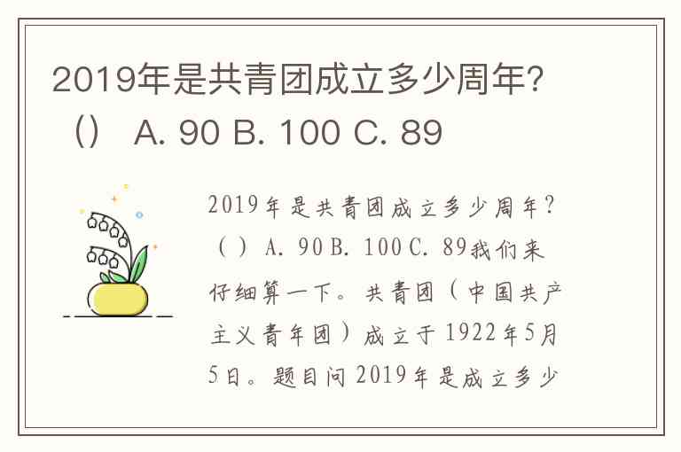 2019年是共青团成立多少周年?() A. 90 B. 100 C. 89