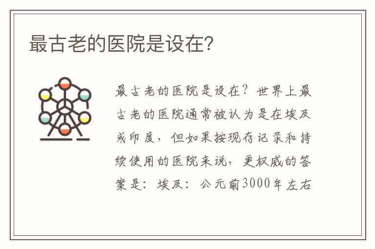 如果你问的是**“世界上第一个医院在哪里建立的”,标准历史学观点多认为是在古印度或古叙利亚地区的寺院/教会附属医疗设施**。