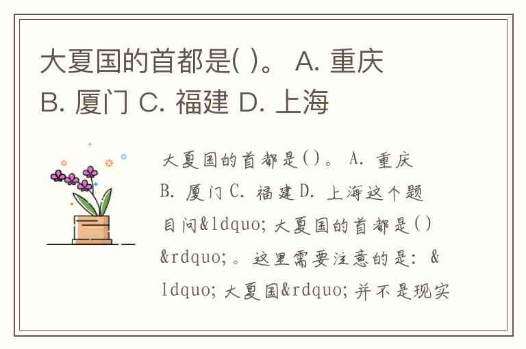 大夏国的首都是( )。 A. 重庆 B. 厦门 C. 福建 D. 上海