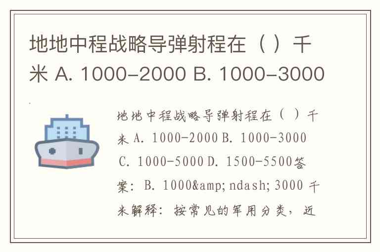 地地中程战略导弹射程在( )千米 A. 1000-2000 B. 1000-3000 C. 1000-5000 D. 1500-5500