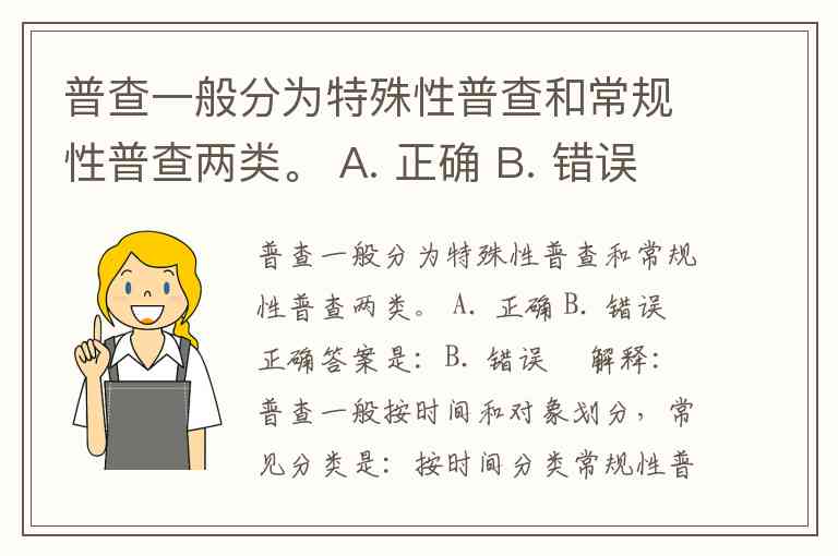 普查一般分为特殊性普查和常规性普查两类。 A. 正确 B. 错误