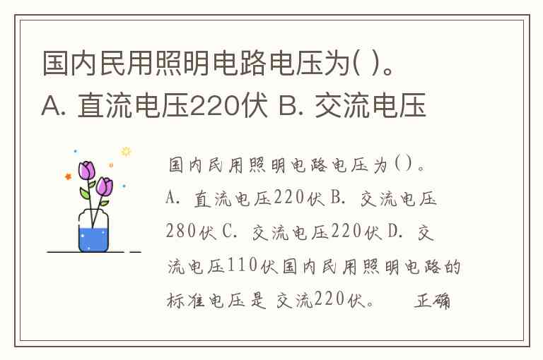 国内民用照明电路电压为( )。 A. 直流电压220伏 B. 交流电压280伏 C. 交流电压220伏 D. 交流电压110伏