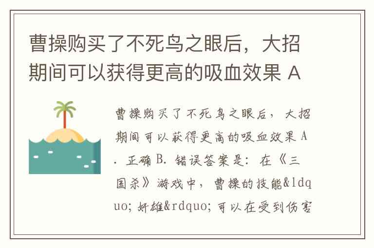 因此,曹操购买“不死鸟之眼”后,在大招期间并不会获得更高的吸血效果。他的技能“奸雄”与“不死鸟之眼”的效果是独立的,不会叠加。
