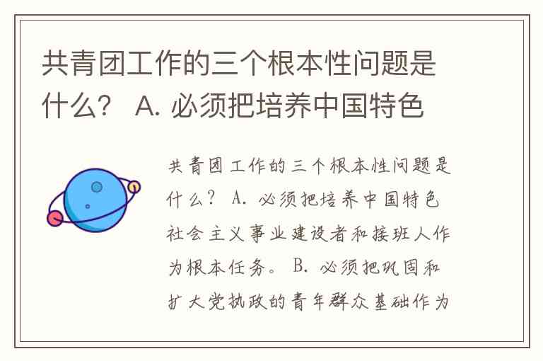 根据共青团工作的基本原则和方针,共青团工作的“三个根本性问题”是指团组织必须始终把握的根本方向和任务。它们具体是: