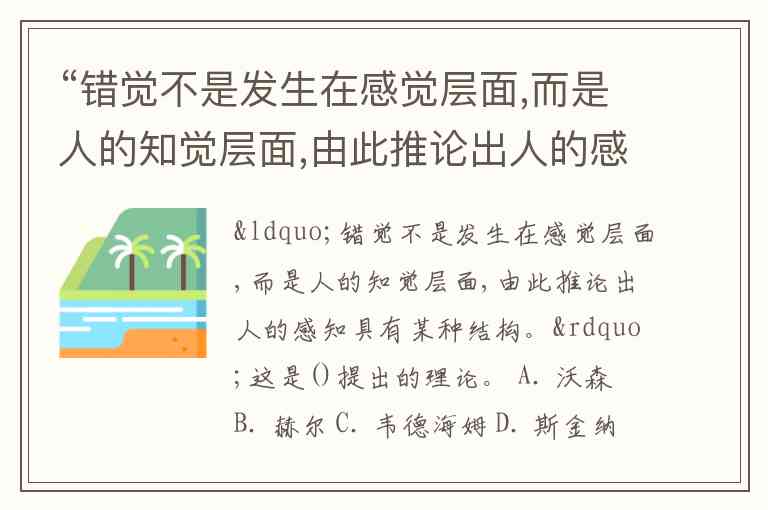 “错觉不是发生在感觉层面,而是人的知觉层面,由此推论出人的感知具有某种结构。”这是()提出的理论。 A. 沃森 B. 赫尔 C. 韦德海姆 D. 斯金纳