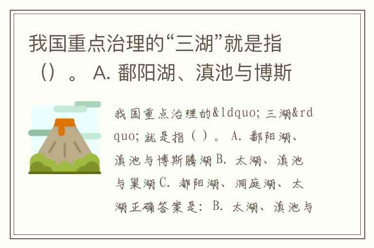 我国重点治理的“三湖”就是指()。 A. 鄱阳湖、滇池与博斯腾湖 B. 太湖、滇池与巢湖 C. 都阳湖、洞庭湖、太湖