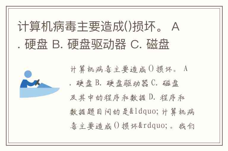 计算机病毒主要造成()损坏。 A. 硬盘 B. 硬盘驱动器 C. 磁盘及其中的程序和数据 D. 程序和数据