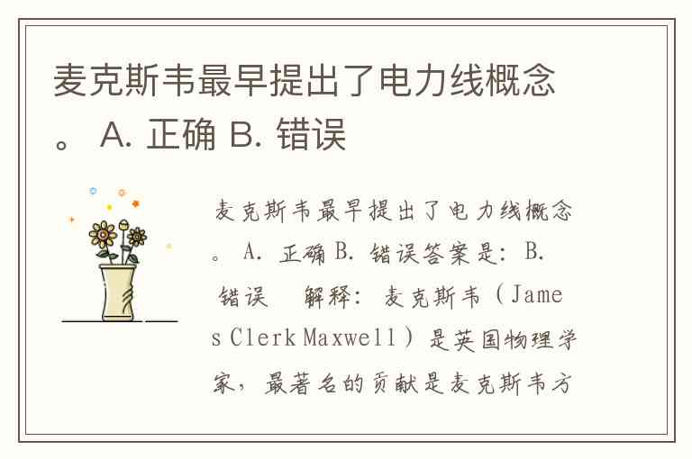 麦克斯韦(James Clerk Maxwell)是英国物理学家,最著名的贡献是麦克斯韦方程组,系统描述了电场、磁场以及电磁波的关系。他没有提出电力线(电力传输线路)的概念。电力线概念更多与电力工程和特斯拉、爱迪生等电气工程师的实践有关。