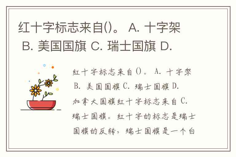 红十字标志来自()。 A. 十字架 B. 美国国旗 C. 瑞士国旗 D. 加拿大国旗