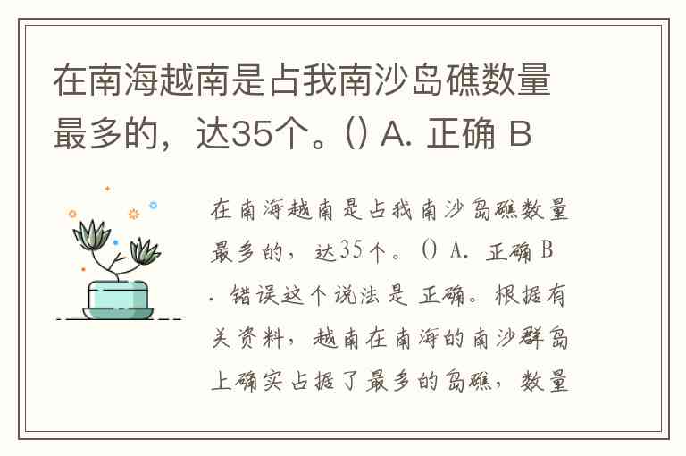 在南海越南是占我南沙岛礁数量最多的,达35个。() A. 正确 B. 错误