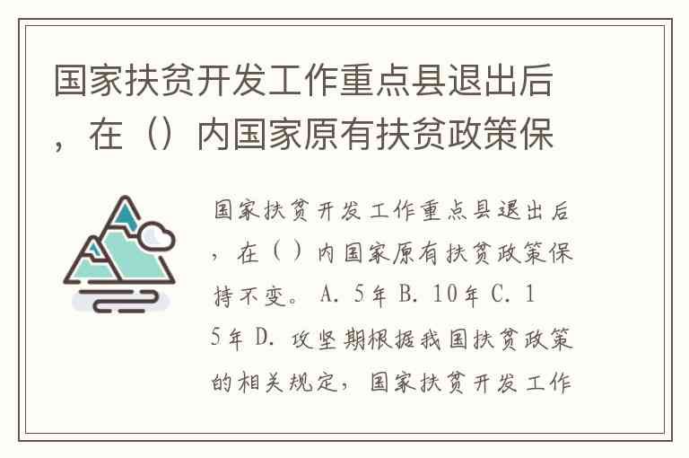国家扶贫开发工作重点县退出后,在()内国家原有扶贫政策保持不变。 A. 5年 B. 10年 C. 15年 D. 攻坚期