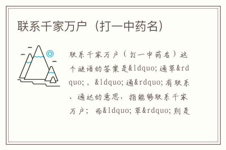 谜语“联系千家万户打一中药”的谜底是贯众,该谜语通过“联系千家万户”的意象,隐喻贯众作为中药广泛连接和覆盖的特性。