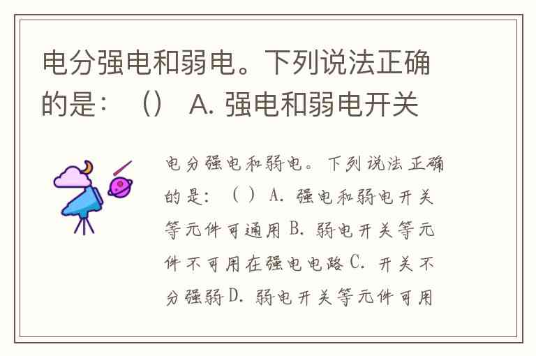 电分强电和弱电。下列说法正确的是:() A. 强电和弱电开关等元件可通用 B. 弱电开关等元件不可用在强电电路 C. 开关不分强弱 D. 弱电开关等元件可用在强电电路