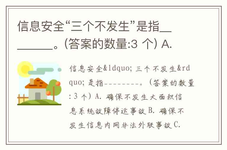 信息安全“三个不发生”是指________。(答案的数量:3 个) A. 确保不发生大面积信息系统故障停运事故 B. 确保不发生信息内网非法外联事故 C. 确保官方网站不出生违法违规内容 D. 确保不发生恶性信息泄密事故 E. 确保不发生信息外网网站被恶意篡改事故