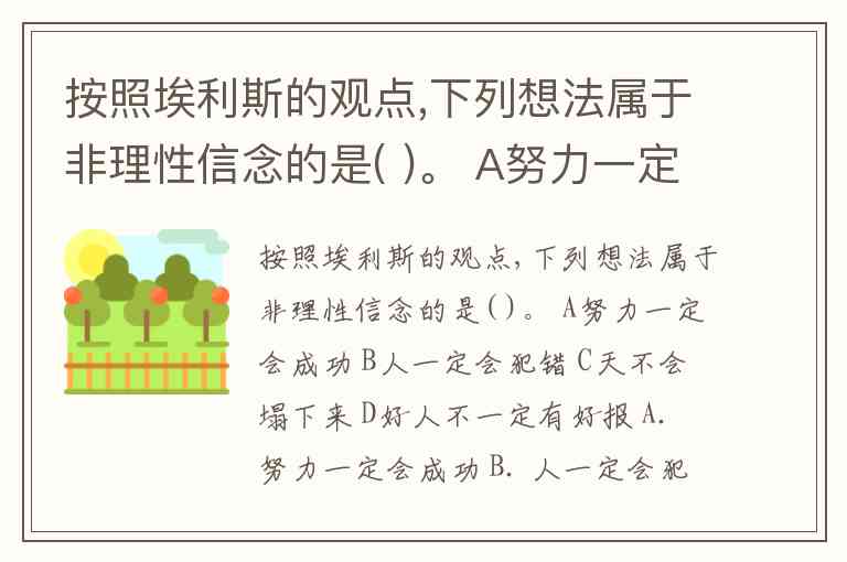 按照埃利斯的观点,下列想法属于非理性信念的是( )。 A努力一定会成功 B人一定会犯错 C天不会塌下来 D好人不一定有好报 A. 努力一定会成功 B. 人一定会犯错 C. 天不会塌下来 D. 好人不一定有好报