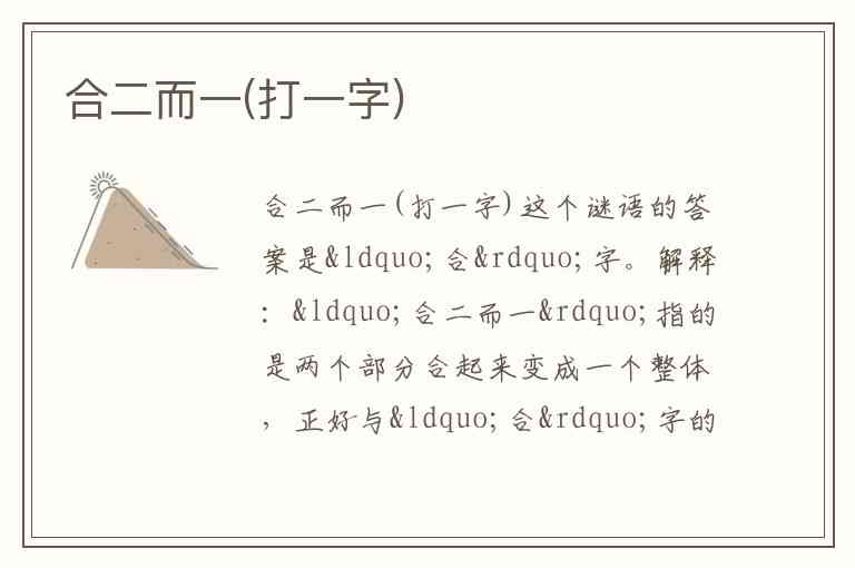 解题思路:“二而一”合起来,组成字:“面”。二+而+一=面。