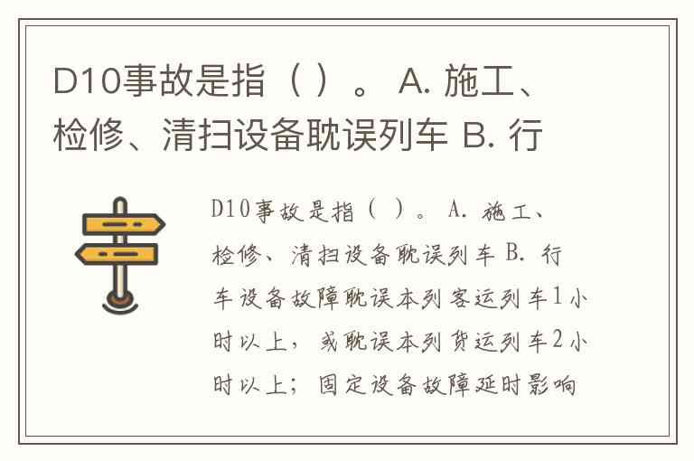 D10事故是指( )。 A. 施工、检修、清扫设备耽误列车 B. 行车设备故障耽误本列客运列车1小时以上,或耽误本列货运列车2小时以上;固定设备故障延时影响正常行车2小时以上(仅指正线) C. 作业人员违反劳动纪律、作业纪律耽误列车 D. 列车运行中碰撞轻型车辆、小车、施工机械、机具、防护栅栏等设备设施或路料、坍体、落石