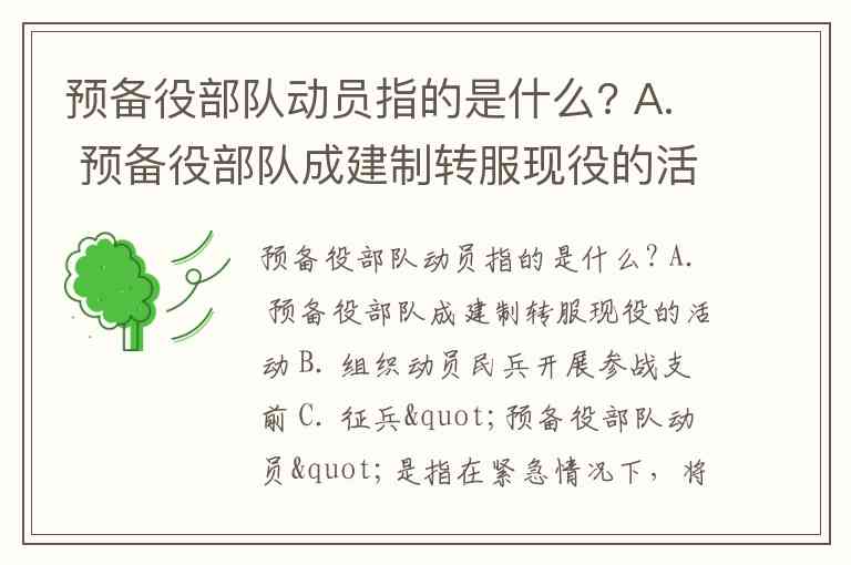 "预备役部队动员"是指在紧急情况下,将预备役部队中的人员和装备按照需要调动、编配到现役部队中,以应对突发的战斗或军事任务。