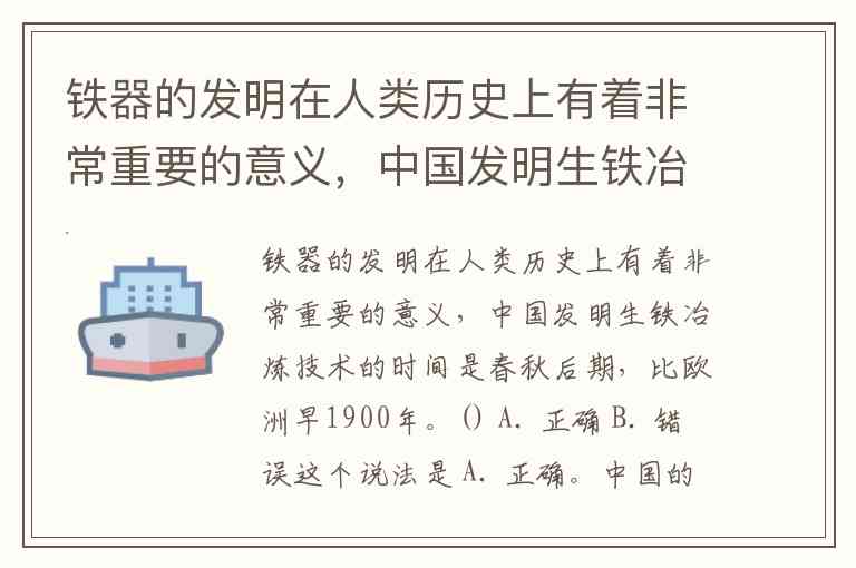 铁器的发明在人类历史上有着非常重要的意义,中国发明生铁冶炼技术的时间是春秋后期,比欧洲早1900年。() A. 正确 B. 错误