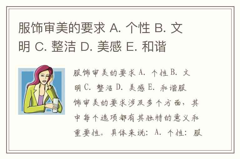 服饰审美的要求 A. 个性 B. 文明 C. 整洁 D. 美感 E. 和谐