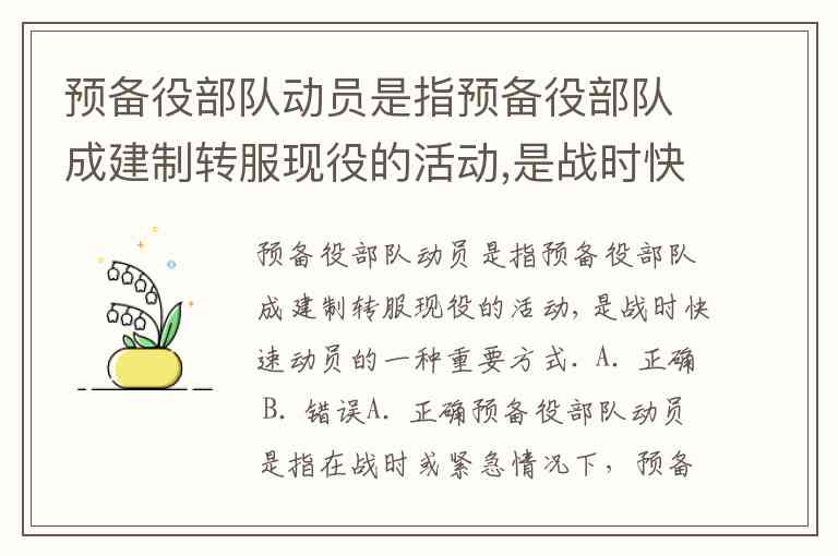 预备役部队动员是指预备役部队成建制转服现役的活动,是战时快速动员的一种重要方式. A. 正确 B. 错误