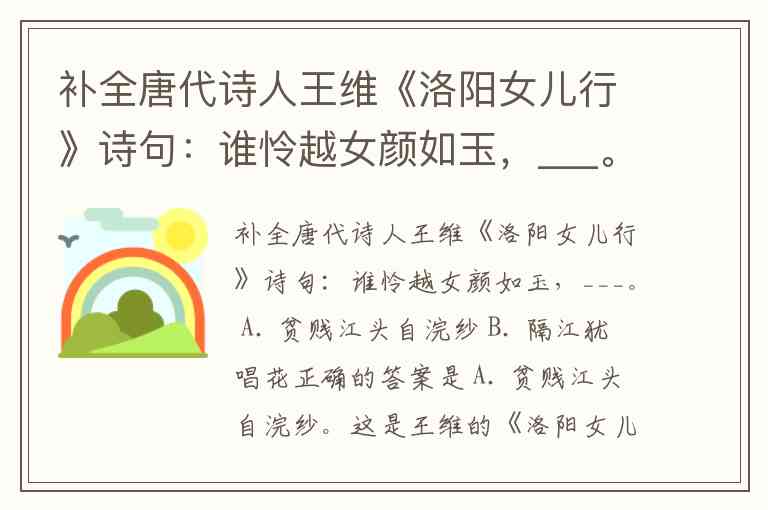 补全唐代诗人王维《洛阳女儿行》诗句:谁怜越女颜如玉,___。 A. 贫贱江头自浣纱 B. 隔江犹唱花