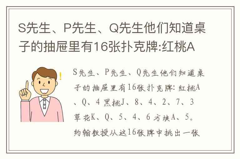 S先生、P先生、Q先生他们知道桌子的抽屉里有16张扑克牌:红桃A、Q、4 黑桃J、8、4、2、7、3 草花K、Q、5、4、6 方块A、5。约翰教授从这16张牌中挑出一张牌来,并把这张牌的点数告诉 P先生,把这张牌的花色告诉Q先生。这时,约翰教授问P先生和Q 先生:你们能从已知的点数或花色中推知这张牌是什么牌吗? 于是,S先生听到如下的对话: P先生:我不知道这张牌。 Q先生:我知道你不知道这张牌。 P先生:现在我知道这张牌了。 Q先生:我也知道了。 听罢以上的对话,S先生想了一想之后,就正确地推出这张牌是什么牌。 请问:这张牌是什么牌? A. 方块5 B. 红桃A C. 黑桃J D. 草花K