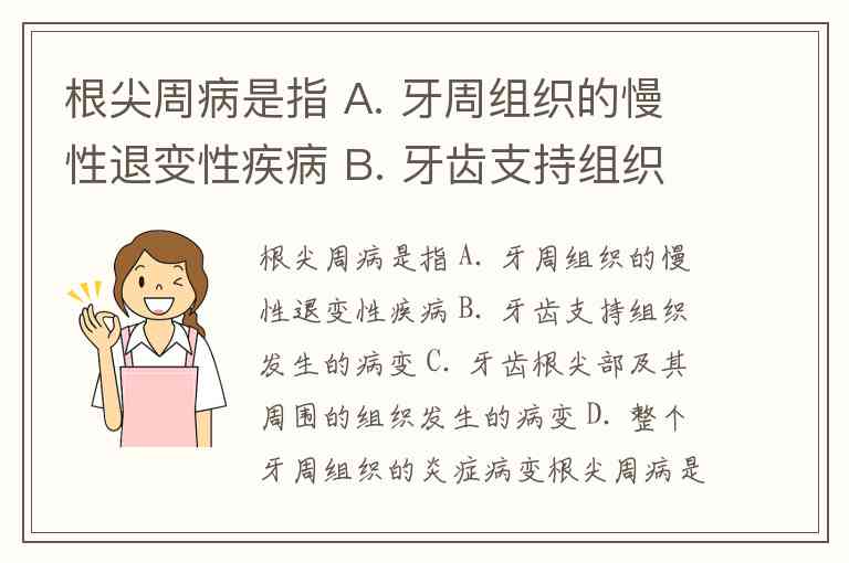 根尖周病是指 A. 牙周组织的慢性退变性疾病 B. 牙齿支持组织发生的病变 C. 牙齿根尖部及其周围的组织发生的病变 D. 整个牙周组织的炎症病变