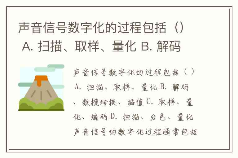 声音信号数字化的过程包括() A. 扫描、取样、量化 B. 解码、数模转换、插值 C. 取样、量化、编码 D. 扫描、分色、量化