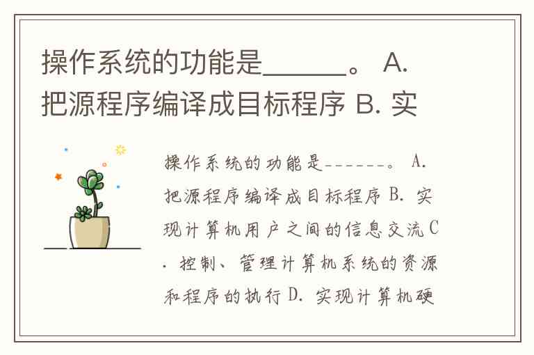 操作系统的功能是______。 A. 把源程序编译成目标程序 B. 实现计算机用户之间的信息交流 C. 控制、管理计算机系统的资源和程序的执行 D. 实现计算机硬件和软件之间的转换