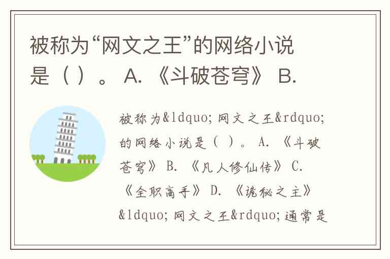 被称为“网文之王”的网络小说是( )。 A. 《斗破苍穹》 B. 《凡人修仙传》 C. 《全职高手》 D. 《诡秘之主》